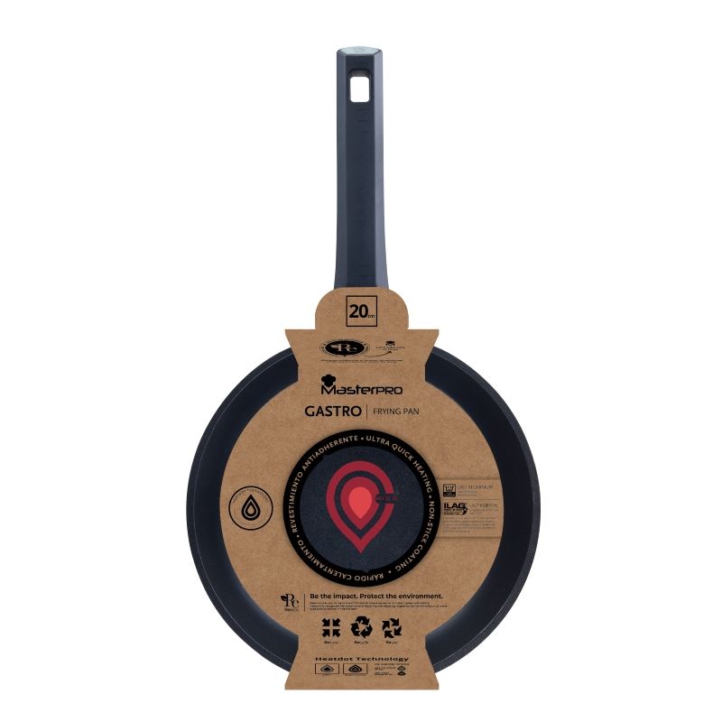 Koken en braden met een kleinere ecologische voetafdruk kan met de Gastro koekenpannen van Bergner Masterpro. De body van deze pan is gemaakt van 100% gerecycled aluminium. Uniek aan deze serielijn is dat de pannen zijn uitgerust met de heatdot indicator zodat je jouw gerechten altijd op de juiste temperatuur kan bereiden en zo ook oververhitting kan voorkomen. De pannen zijn te gebruiken op alle warmtebronnen, ook op inductie.