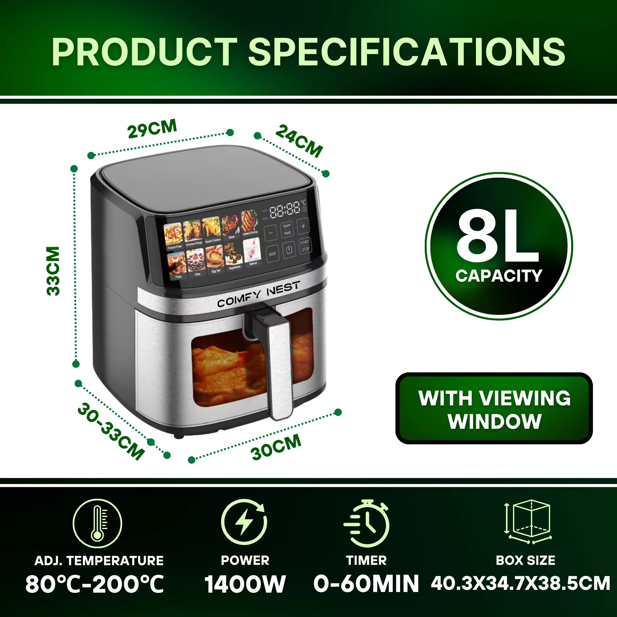 Deze airfryer biedt een digitaal display voor naadloze navigatie door de vooraf ingestelde kookprogramma's. Of u nu frietjes, kippenvleugels, gebraden kip, biefstuk, groenten, gegrilde garnalen of zelfs desserts zoals cake of eierpasteitjes maakt, de vooraf ingestelde opties stellen u in staat om perfect gekookte gerechten te bereiken met één druk op de knop en heeft zelfs een ontdooifunctie. De instelbare temperatuurregeling (80°C tot 200°C) en een timer van 0-60 minuten bieden flexibiliteit voor een breed scala aan recepten, waardoor het een must-have is voor elke keuken. Bovendien kunt u met het kijkvenster het kookproces in de gaten houden zonder het te onderbreken, wat elke keer nauwkeurige resultaten garandeert.