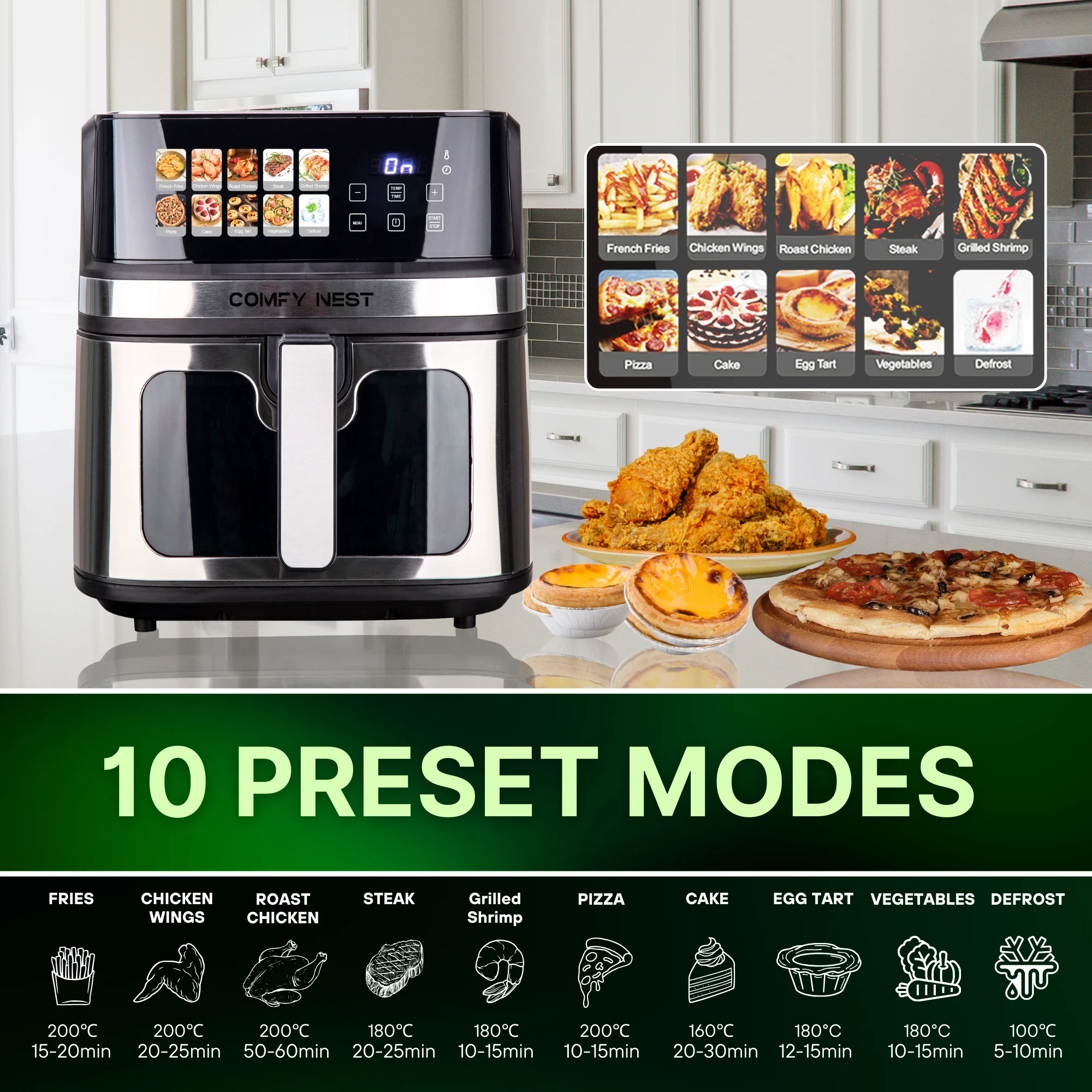 • Vooraf ingestelde kookstand: Franse frietjes, kippenvleugels, gebraden kip, biefstuk, gegrilde garnalen, pizza, cake, eiertaart, groenten, ontdooien
