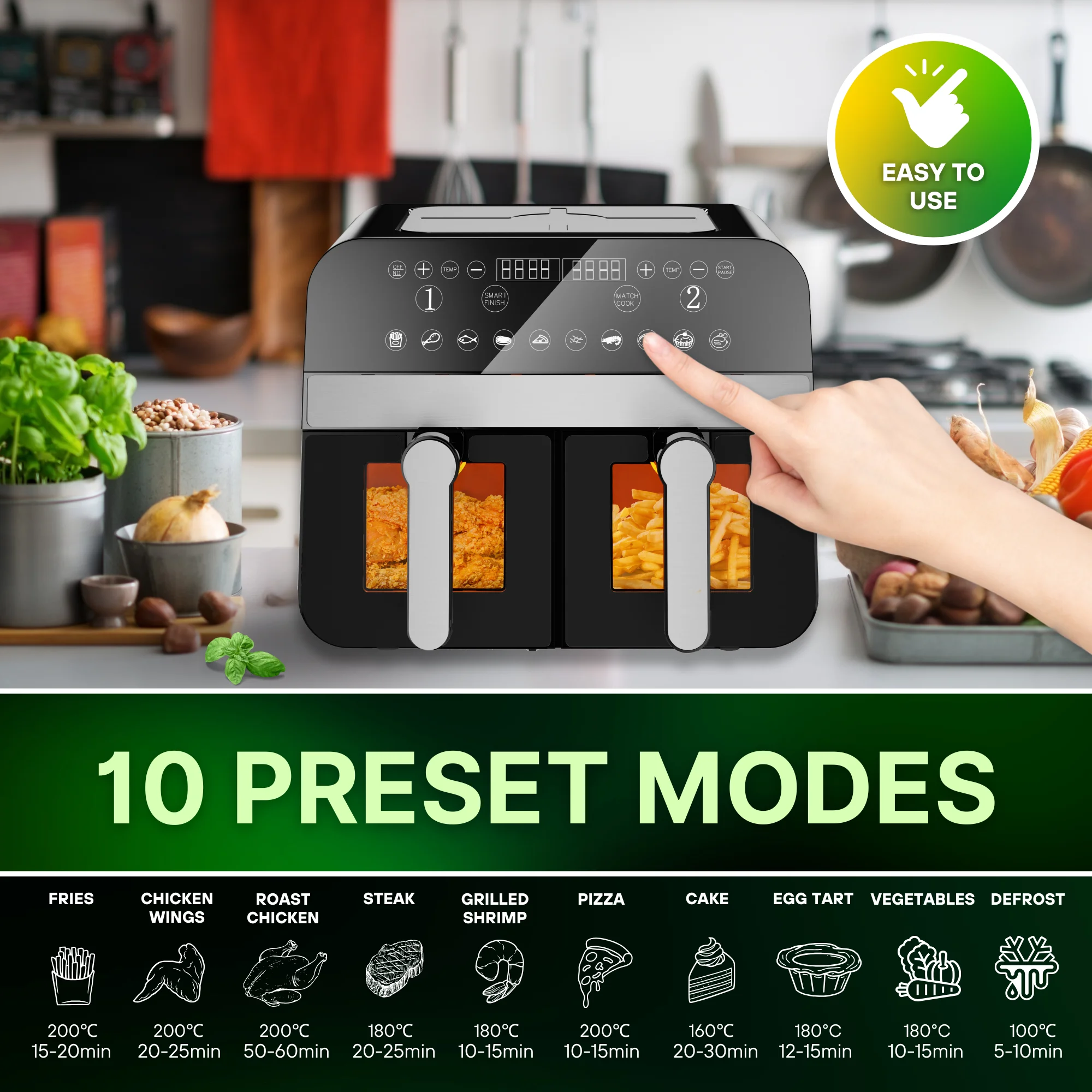 - 10 kookfuncties – Biedt 10 vooraf ingestelde kookprogramma's, waaronder populaire opties zoals friet, kip en groenten, wat snelle maaltijdbereiding met één druk op de knop mogelijk maakt.