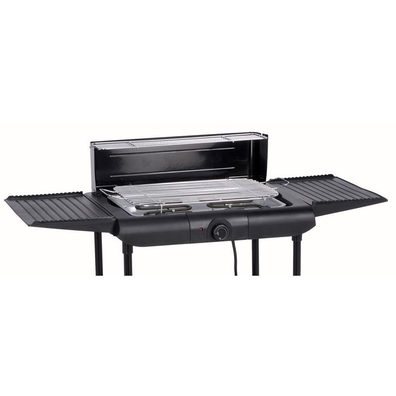 • Een elektrische barbecue met 2 zijtafels en extra plateau op voet.