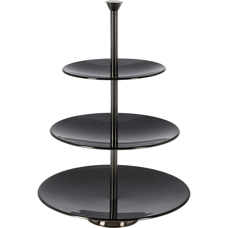 Stijlvolle zwarte etagere van RVS om je bonbons en koekjes op te presenteren aan je gasten, ook erg leuk voor een high tea. De etagere heeft 3 plateaus, waardoor je er diverse hapjes op kan plaatsen.