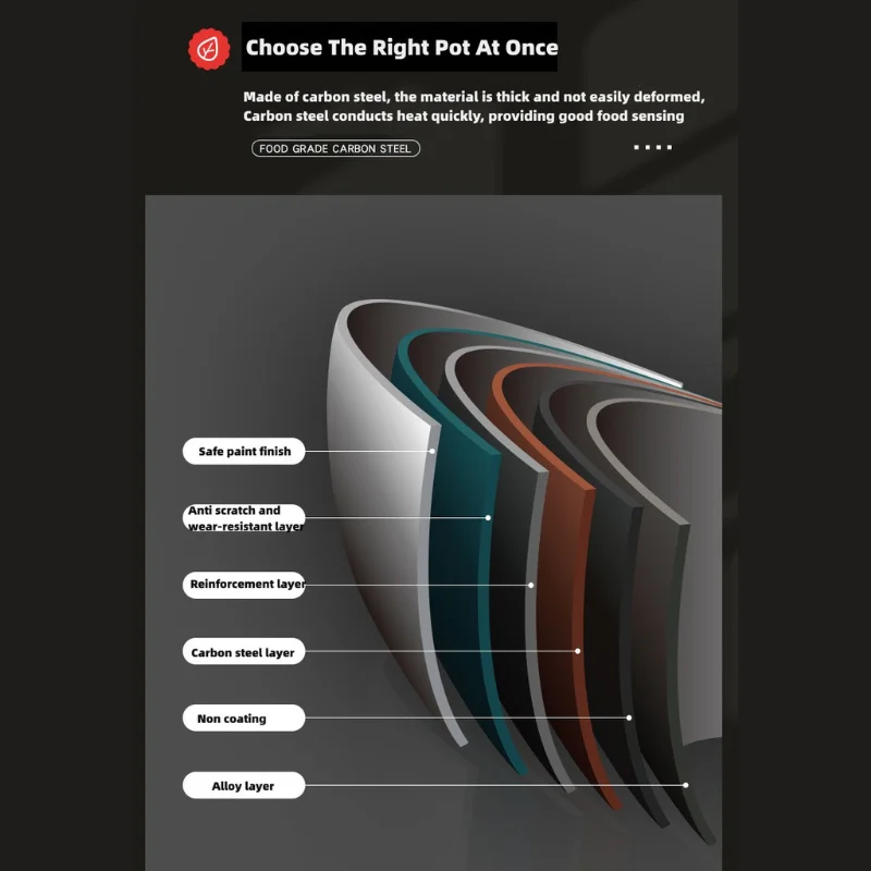 - 6-laags constructie: vervaardigd met een meerlaagse constructie, inclusief een veilige verfafwerking, antikras- en slijtvaste laag, verstevigingslaag, koolstofstaallaag, antiaanbaklaag en legeringslaag, waardoor duurzaamheid, veiligheid en optimale kookprestaties.