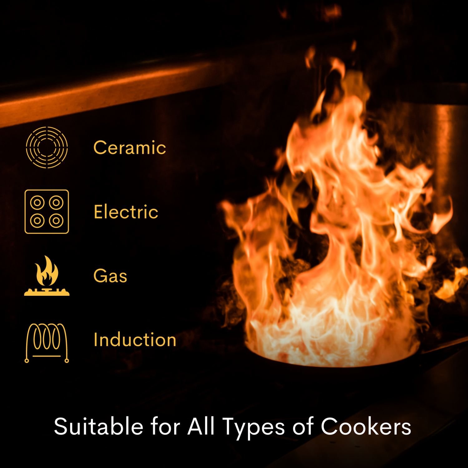 De pannenset heeft een inductiebodem zonder logo waardoor hij compatibel is met alle kookplaten. Deze pannenset voldoet aan uw behoeften, of u nu een elektrisch, gas- of inductiefornuis gebruikt om maaltijden te bereiden.