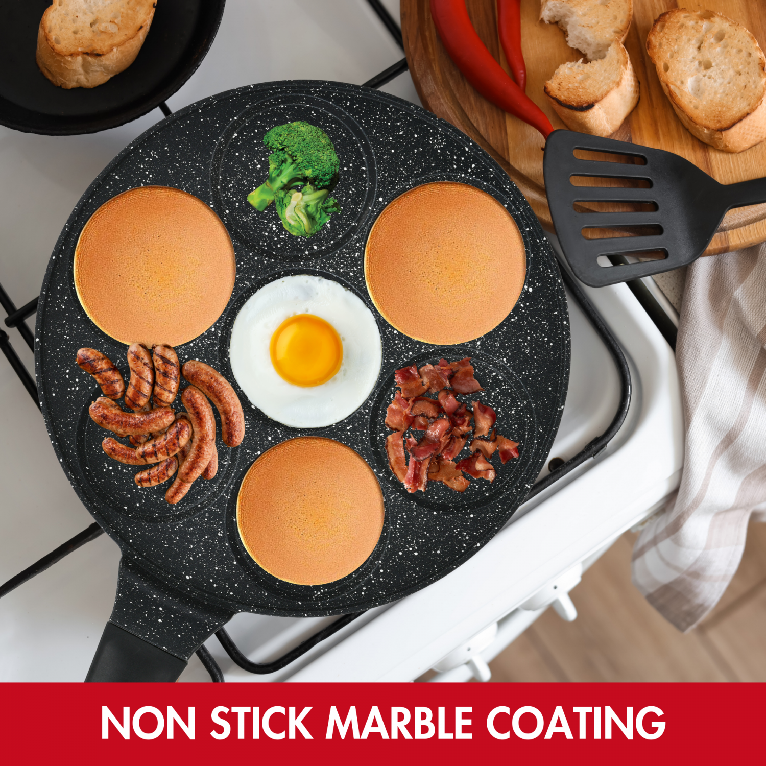 - Eenvoudig omdraaien en opbergen: Pannenkoeken omdraaien is een fluitje van een cent met zeven vormen die ontworpen zijn om snel en gemakkelijk om te draaien. Dankzij het ontwerp met ophanggaatjes kun je de pan gemakkelijk opbergen in je keuken en zo kostbare ruimte besparen.