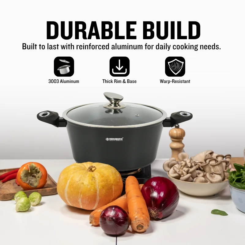 Deze 15-delige set bevat ook drie duurzame keukengerei en twee hittebestendige bakelieten onderzetters, waardoor dit een complete set is voor elk type keuken. Of je nu aan het bakken, sudderen, koken of braden bent, de Herzberg HG-METBK15 combineert moderne elegantie, stevigheid en multifunctioneel gebruik om jouw dagelijkse kookervaring te verbeteren.