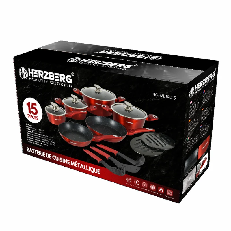 De Herzberg HG-METRD15: 15-delige Pannenset met Marmeren Coating in een stijlvolle glanzend rode afwerking brengt een levendige uitstraling én professionele functionaliteit in je keuken. Deze complete set bevat een uitgebreide selectie van steelpannen, kookpotten, koekenpannen, glazen deksels, keukengerei en hittebestendige onderzetters, zodat je met gemak en vertrouwen de lekkerste maaltijden kunt bereiden. Dankzij de duurzame marmeren antiaanbaklaag kun je koken met minder olie en blijft schoonmaken moeiteloos.