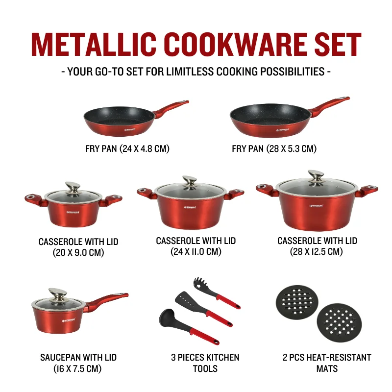 Herzberg HG-METRD15: 15-delige marmeren kookset – Rood