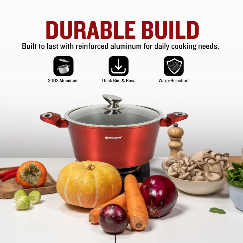 Gemaakt van hoogwaardig 3003 aluminium, zorgt deze pannenset voor een snelle en gelijkmatige warmteverdeling, wat resulteert in perfect gegaarde gerechten. De inductiegeschikte bodem, in combinatie met hittebestendige, met siliconen beklede handgrepen, biedt comfort en veiligheid op elk type kookplaat: gas, elektrisch, keramisch of inductie. De geharde glazen deksels met stoomopening maken het mogelijk om je gerechten in de gaten te houden zonder warmte te verliezen. De lasergegraveerde bodem en de glanzende metallic buitenlaag weerspiegelen de toewijding van Herzberg aan kwaliteit en stijl.