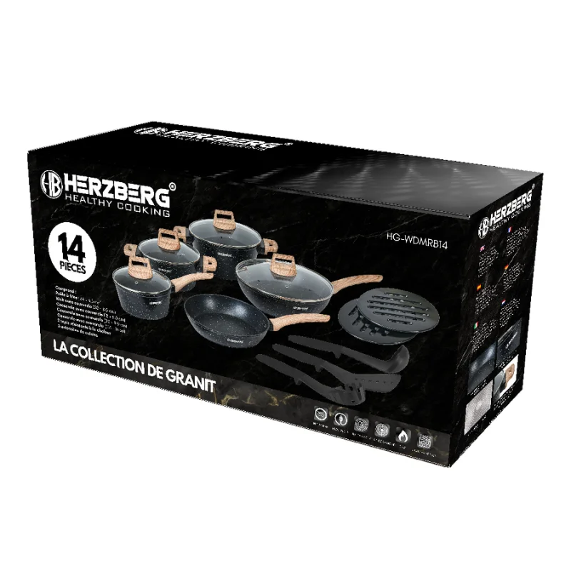 De Herzberg HG-WDMRB14: 14-delige granieten kookset is de perfecte combinatie van strak design en betrouwbare functionaliteit voor moderne keukens. Met een opvallende zwarte granieten afwerking, gecombineerd met handgrepen en dekselknoppen met houten accenten, brengt deze set natuurlijke charme en een eigentijdse flair in uw kookruimte. Gemaakt van gesmeed aluminium van klasse 3003, biedt elk kookgerei superieure warmtegeleiding en duurzaamheid, waardoor het geschikt is voor inductie-, gas-, elektrische, keramische en halogeenkookplaten.