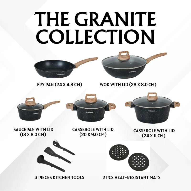 - Hedendaagse graniet- en houtlook: De zwart gespikkelde granieten buitenkant in combinatie met warme houtaccenten geeft deze set een stijlvolle, veelzijdige look die past bij rustieke, moderne of klassieke keukeninterieurs.