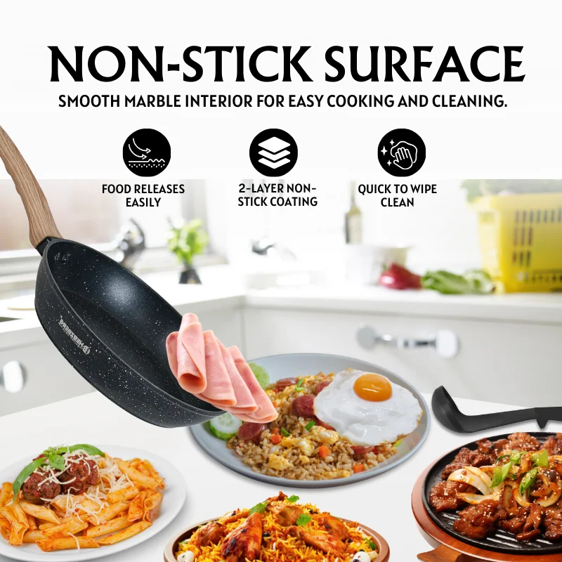 - 2-laagse granieten antiaanbaklaag: De dubbele granieten coating biedt uitstekende antiaanbakeigenschappen, wat zorgt voor gezondere, vetarme maaltijden en een eenvoudige reiniging na elk gerecht.