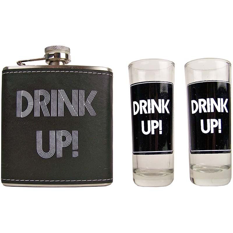Heupfles “Drink UP!” met 2 shot glaasjes