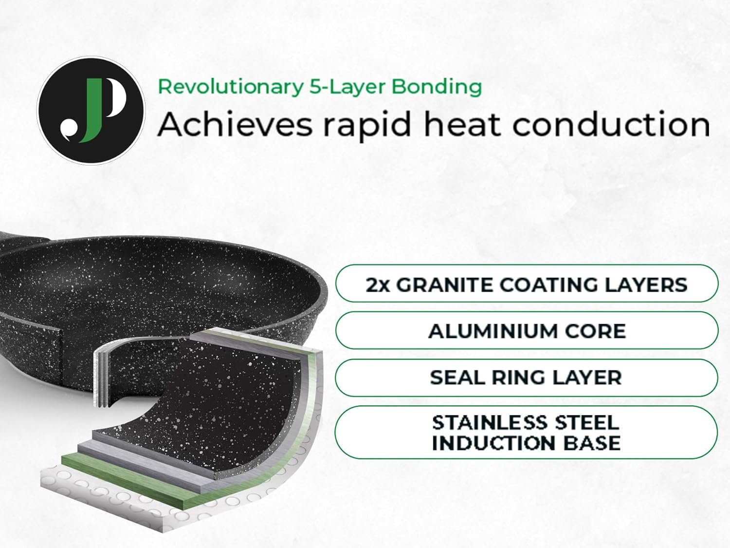 - Warmtestructuur: 5-laags constructie met granieten keramische coating, aluminium kern, afdichtingslaag en roestvrijstalen inductiebodem