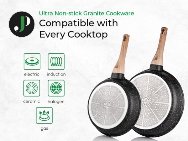 - Graniet keramische antiaanbaklaag – Het meerlaagse graniet keramische oppervlak is PTFE- en PFOA-vrij voor gezonder en toxinevrij koken. Voedsel glijdt er moeiteloos af met minimale olie, waardoor aanbakken, aanbranden en de schoonmaaktijd worden verminderd.