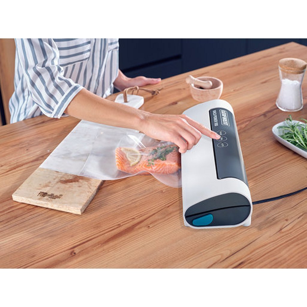 Alle soorten voedsel, zoals vlees, fruit of groenten, blijven tot vijf keer langer vers met de Vacu Power 100.DeVacu Power 100 werkt volledig automatisch en elektrisch en heeft een aparte sealfunctie.De vacuümpomp heeft een capaciteit van vier liter per minuut.DeVacu Power 100kan intuïtief worden bediend via het aanraakscherm van de akoestische sensor.De pulsfunctie is bijzonder praktisch omdat deze kan worden gebruikt om de individuele vacuümsterkte te regelen.De Vacu Power 100 is daarom ook geschikt voor gevoelige voedingsmiddelen.Elektronische temperatuurbewaking zorgt voor veilig gebruik.Het apparaat is compatibel met in de handel verkrijgbare rollen en vacuümzakken met een maximale breedte van 30 cm.Het heeft ook een functie voor hetvacuüm zuigen van containers die apart verkrijgbaar zijn, evenals de hiervoor benodigde slang.
