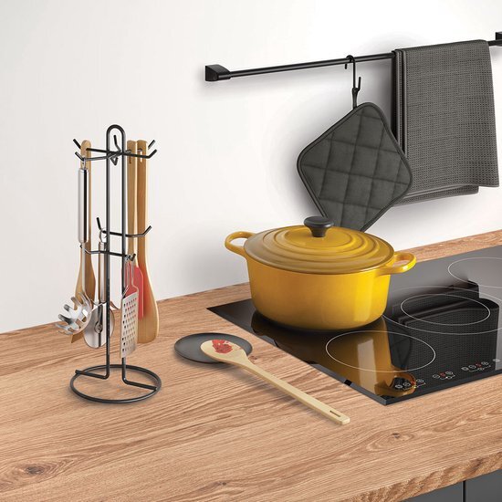 Deze keukengerei houder is een essentieel item voor elke keuken. Deze houder is speciaal ontworpen om je pollepels en ander keukengerei georganiseerd en binnen handbereik te houden. Deze keukengerei houder heeft een elegante zwarte kleur, is gemaakt van roestvrij staal en heeft 10 haken. Aan de bovenste 6 haken kunnen 12 pollepels gehangen worden en aan de onderste 4 kunnen er 8 kooklepels opgehangen worden. Totaal passen er 20 kooklepels aan deze organizer. De afmetingen van de houder zijn: 15 cm breed, 15 cm diep en 43 cm hoog. Aanrecht opgeruimd houden Hoe kan ik het beste mijn keukengerei opbergen? Maak een einde aan rommelige keukenladen en aanrechten en kies met deze stijlvolle keukengerei houder van Tomado Metaltex