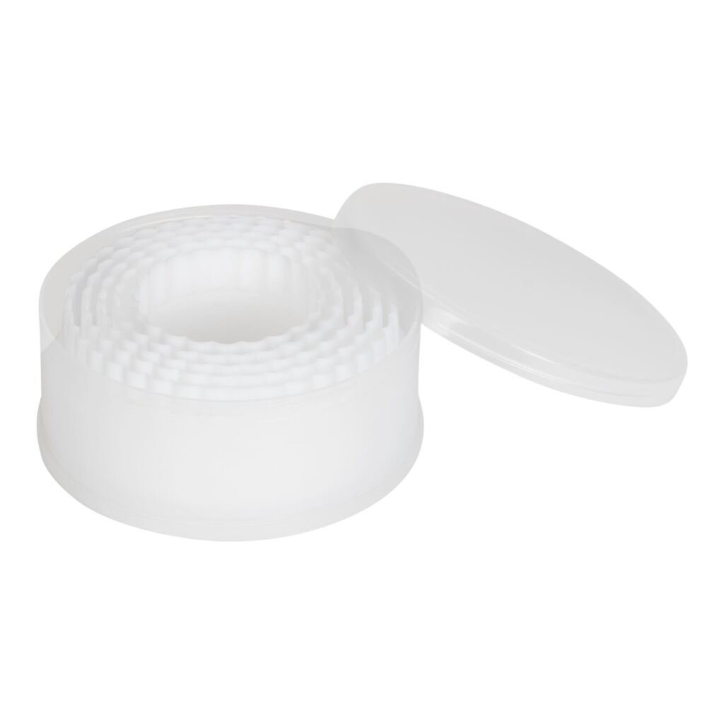 Een 5-delige uitsteekvormenset met 4 gekartelde ronde uitsteekvormen en 1 bewaardoosje. Geschikt voor in de vaatwasser.